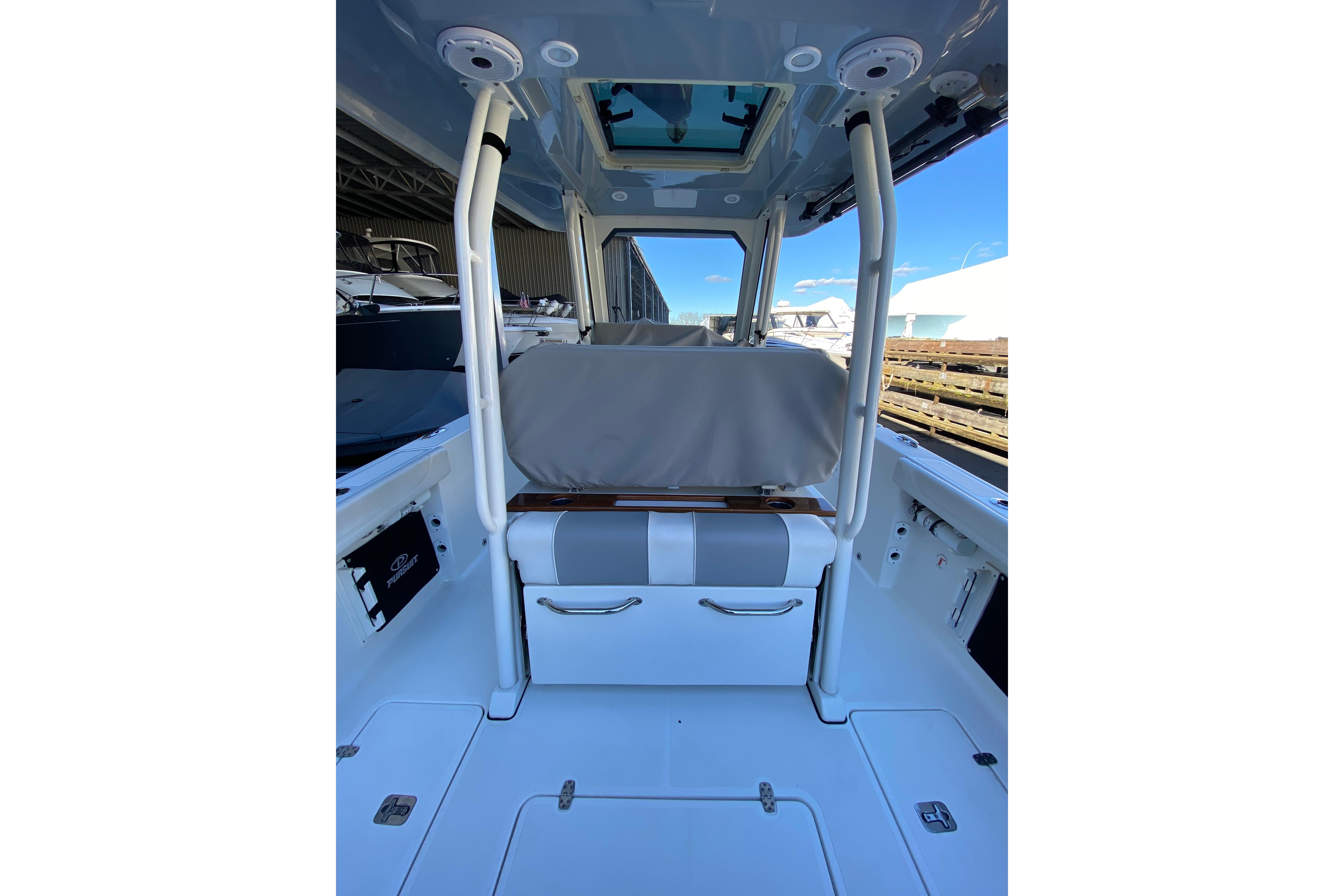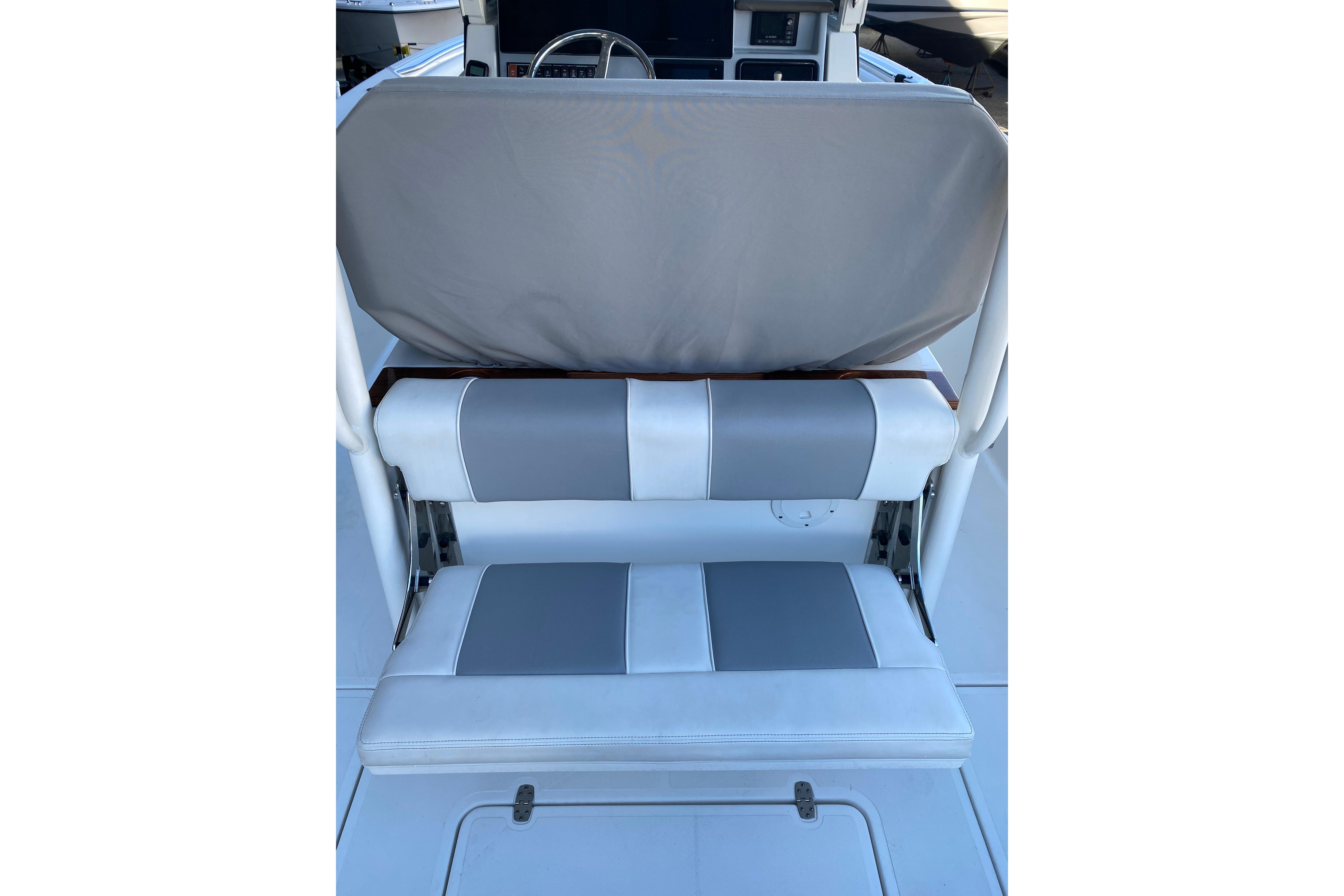 - Molded Helm Seat Console with Drink Holders (2), Dedicated Tackle Storage, Storage Drawers, 12V MDP and Folding Aft Facing Seat