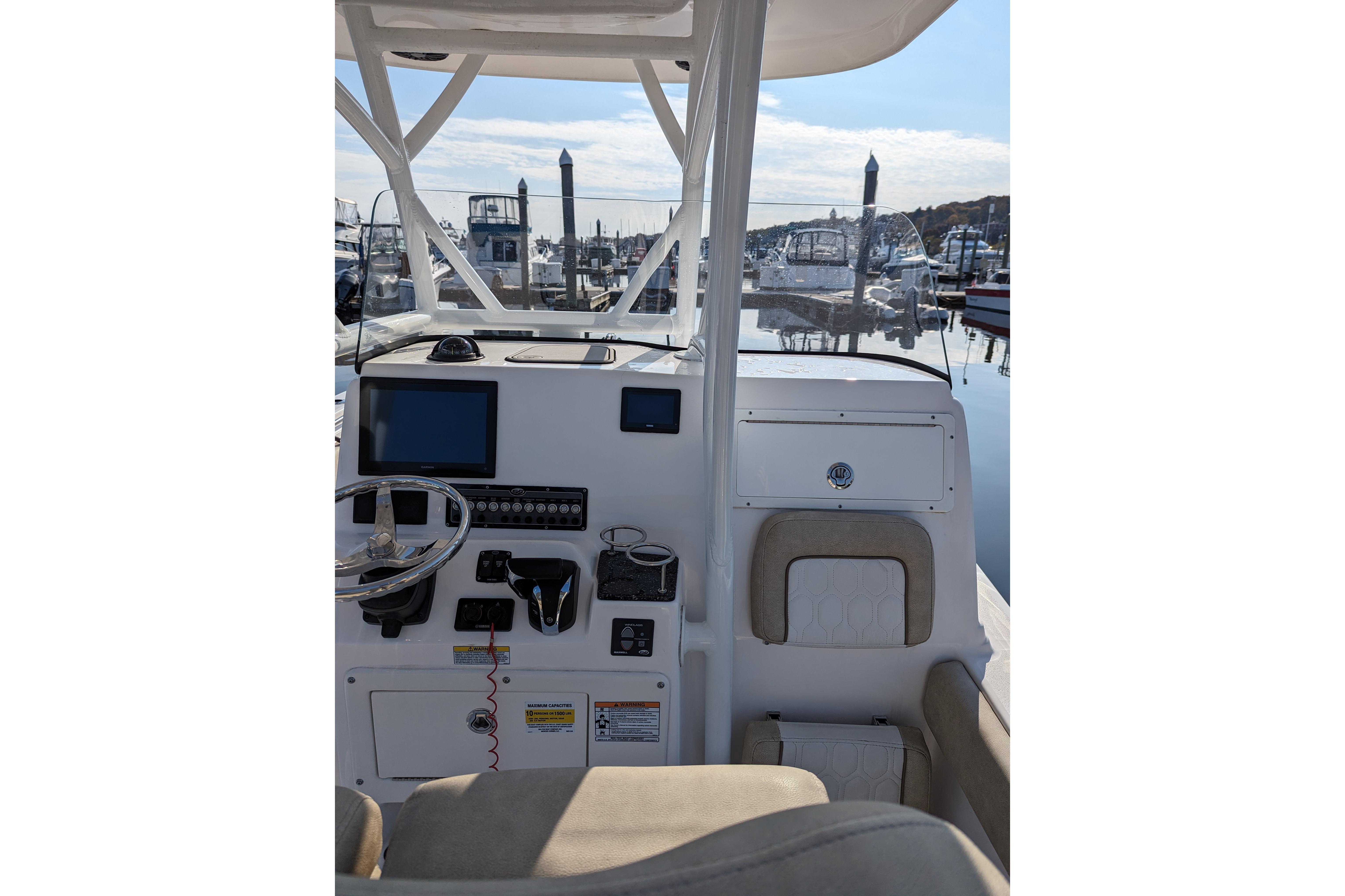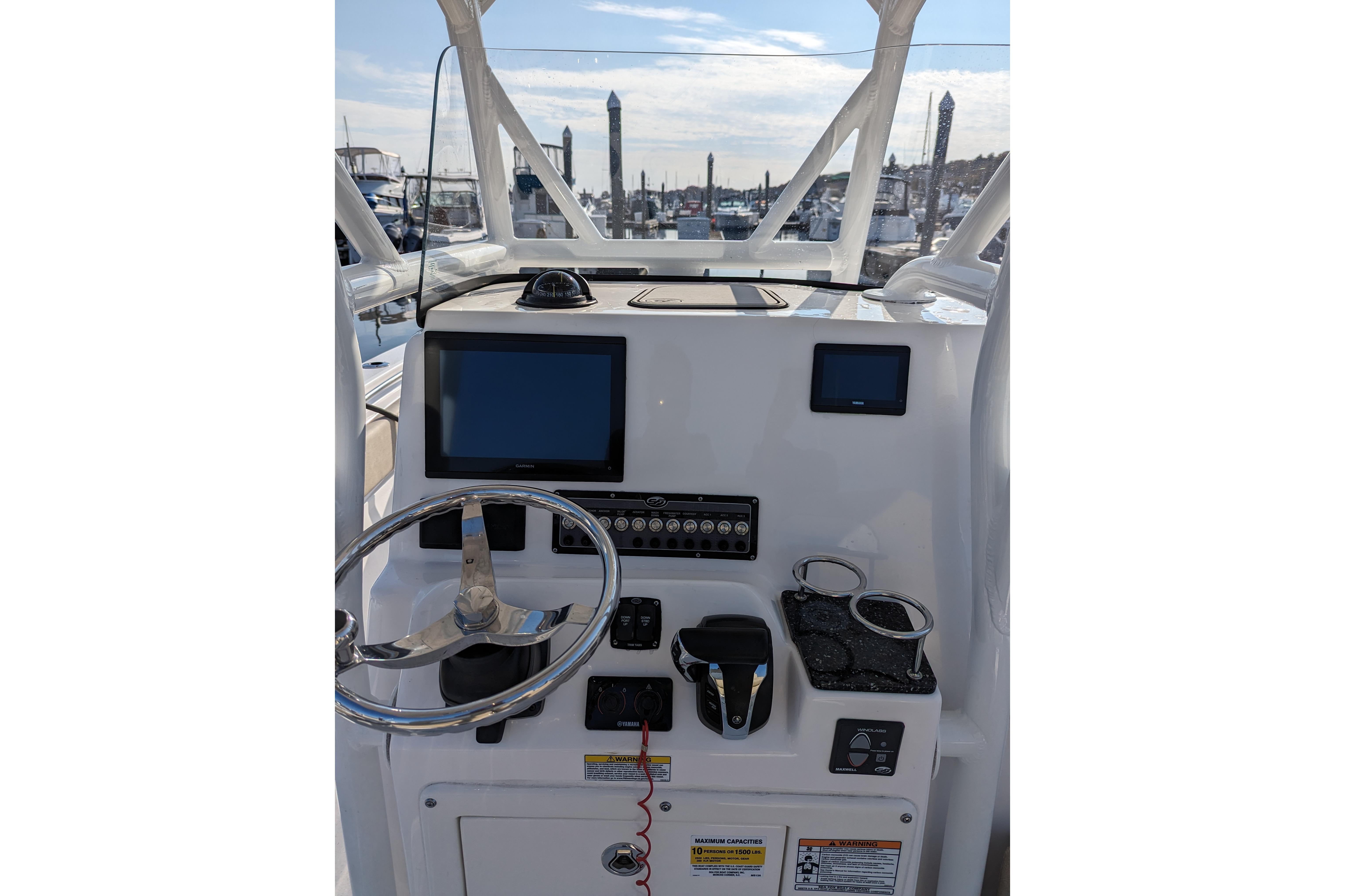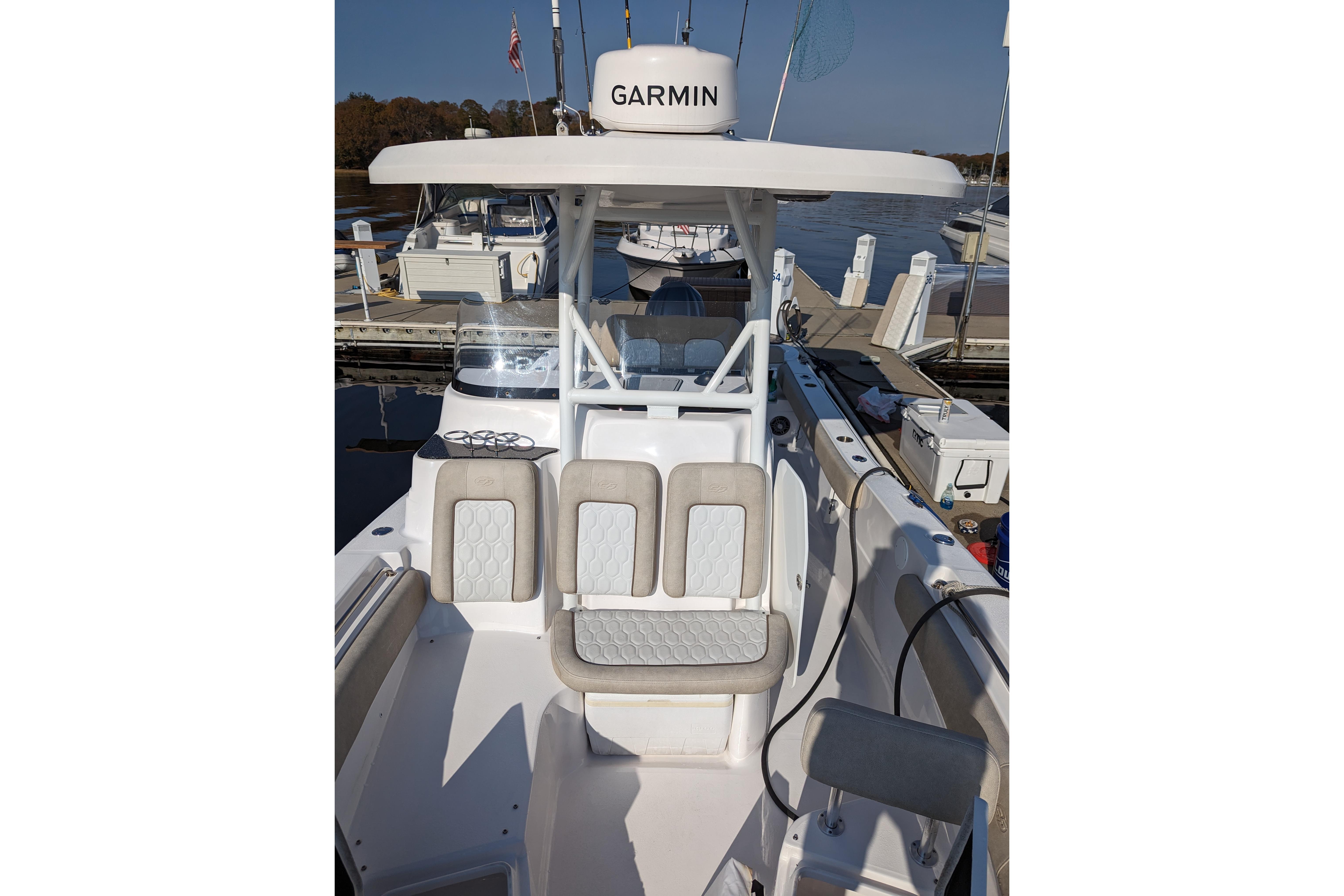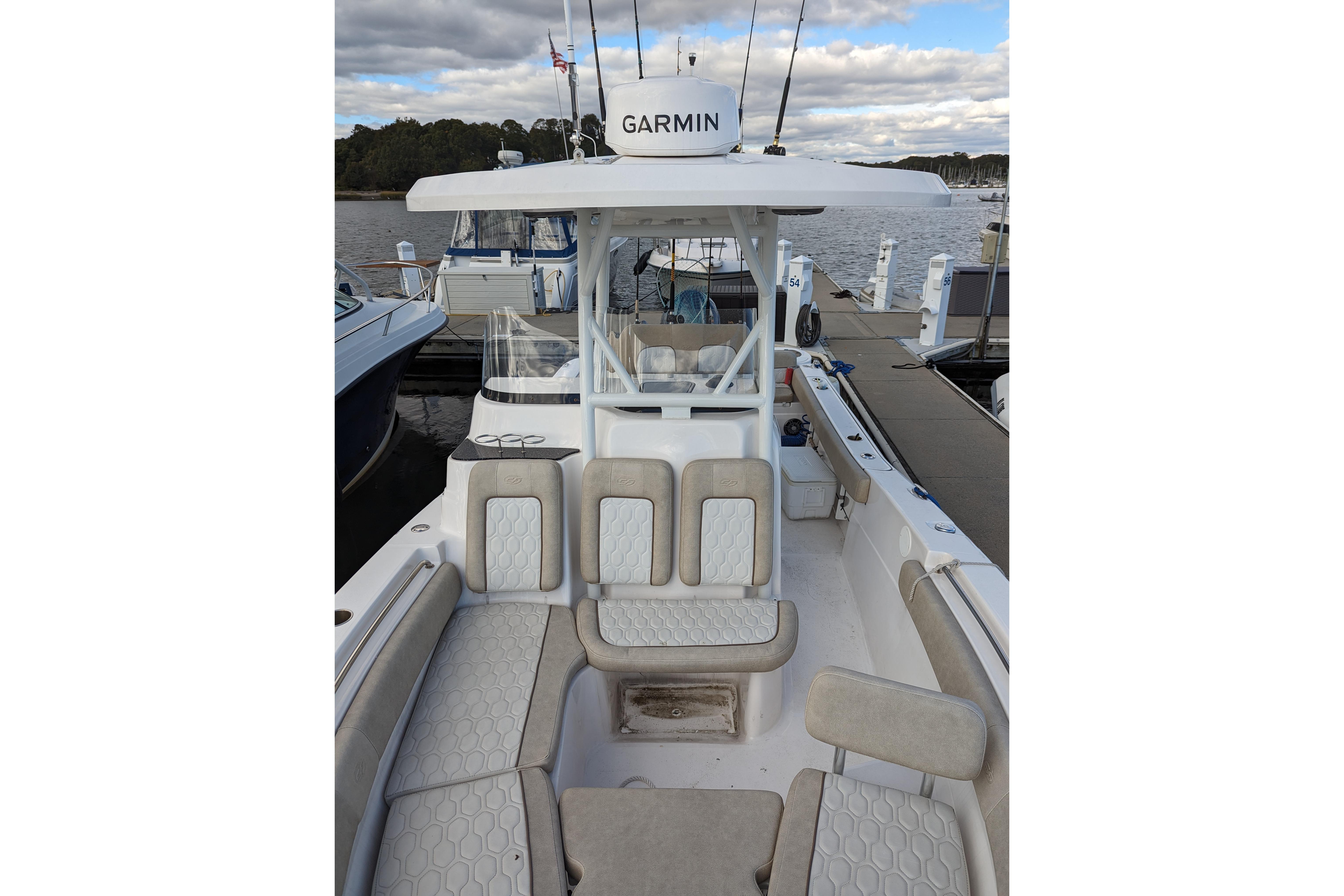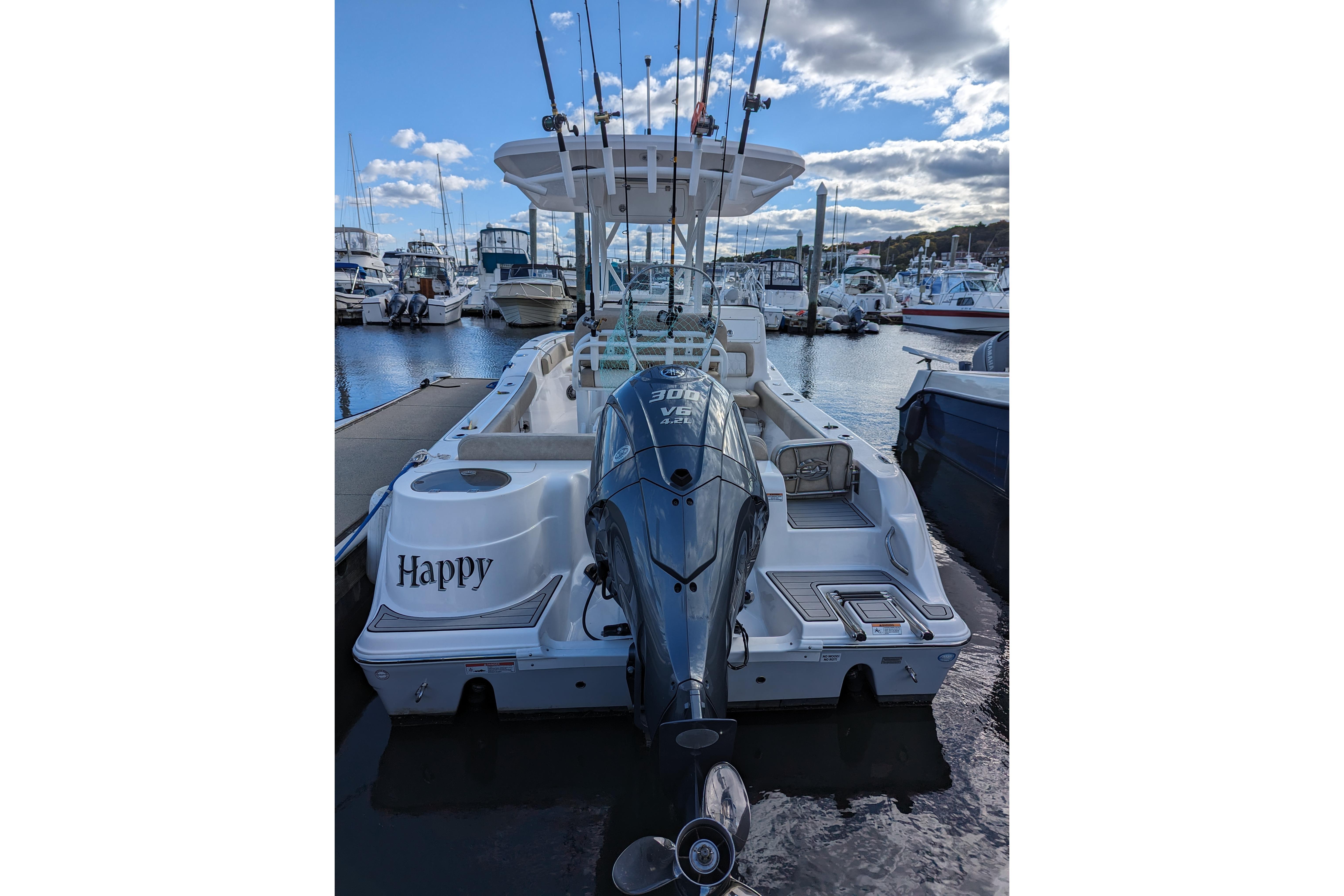 Powered by a single Yamaha F300XCA outboard with low hours, full Garmin electronics suite including radar, anchor windlass, electric head, much more...