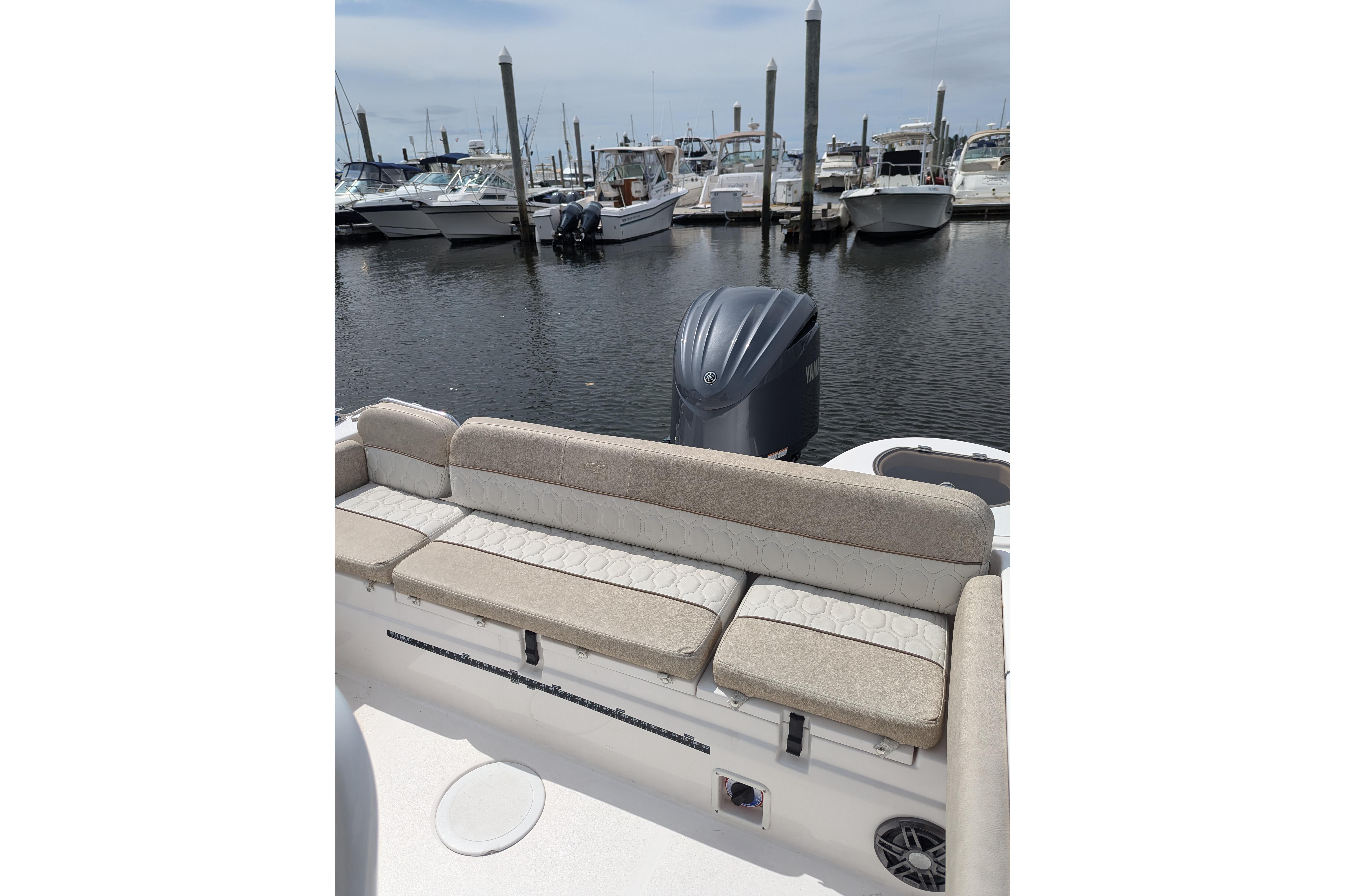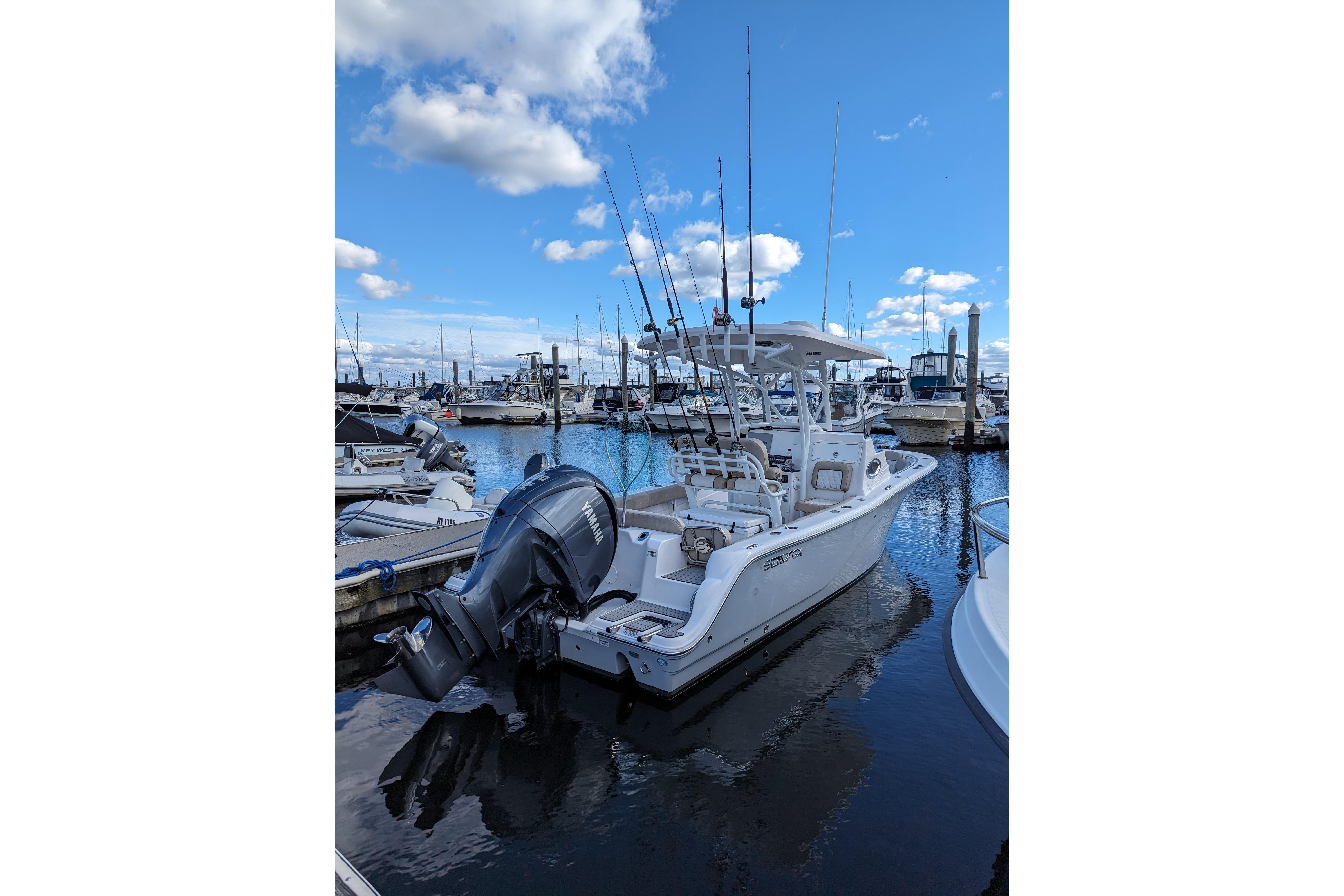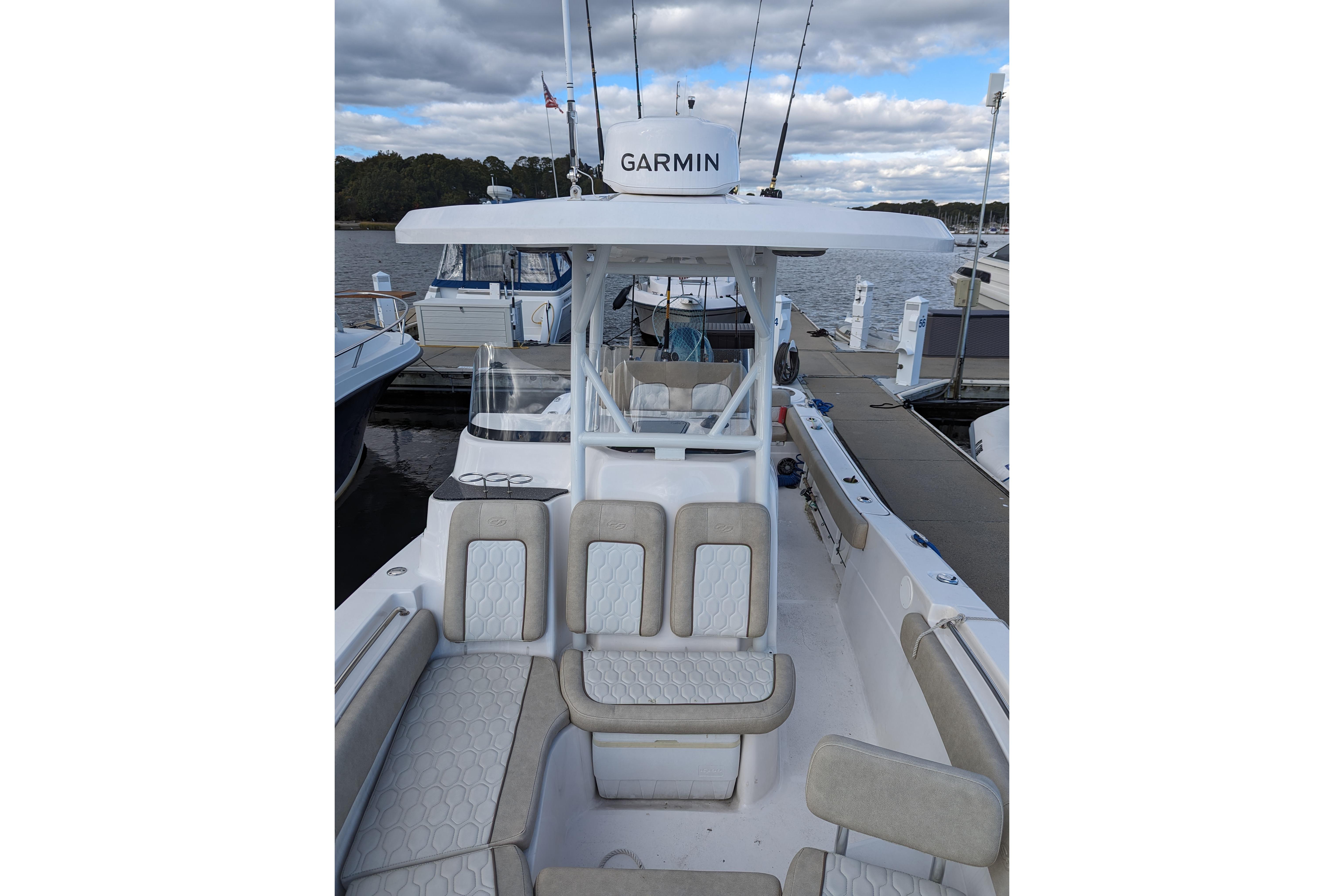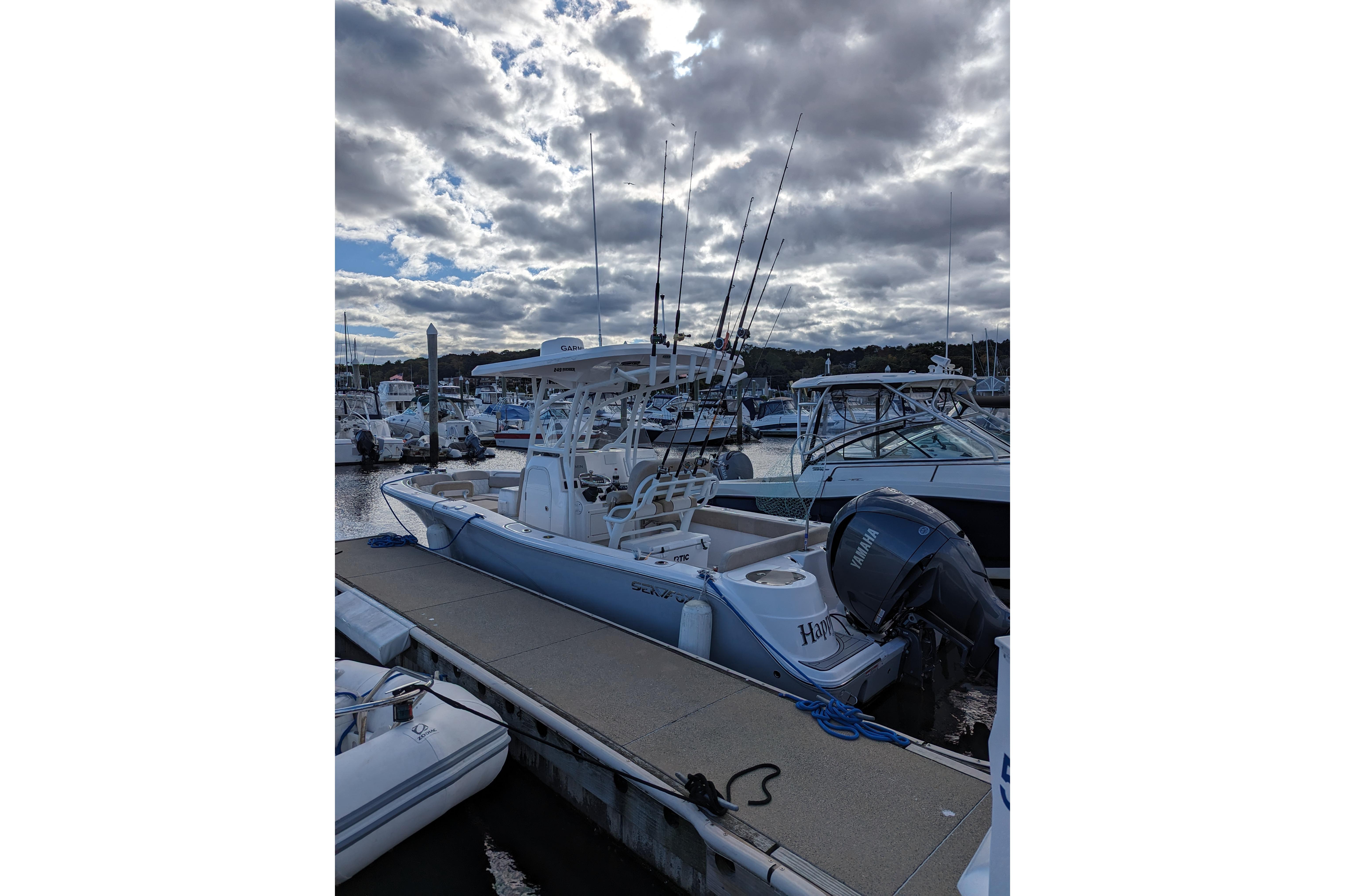 Powered by a single Yamaha F300XCA outboard with low hours, full Garmin electronics suite including radar, anchor windlass, electric head, much more...